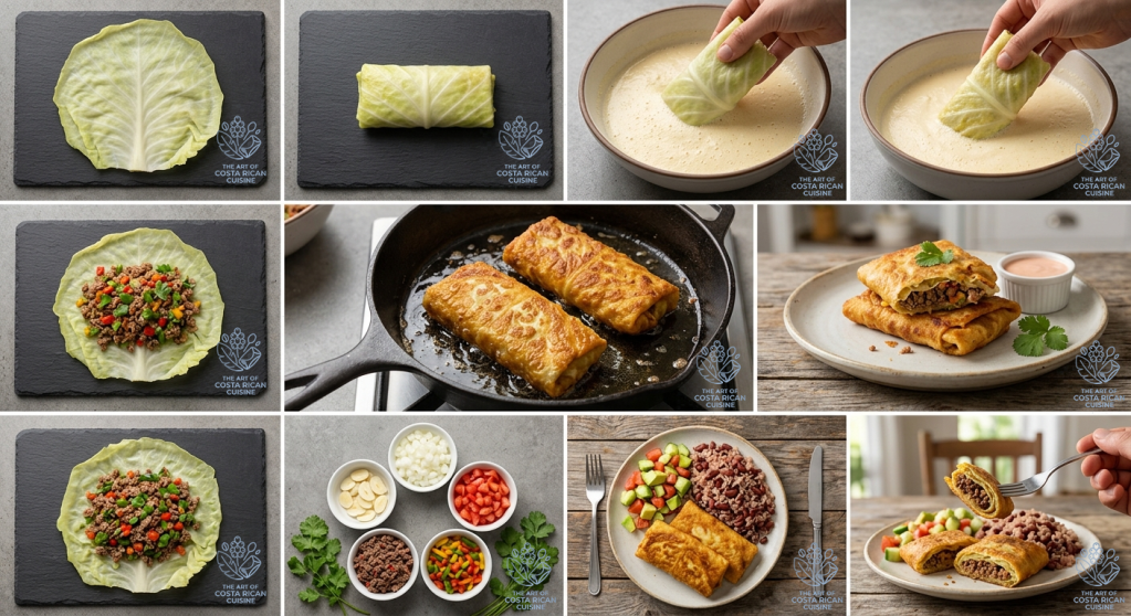 🥬A classic Costa Rican comfort food: tender cabbage leaves filled with seasoned shredded beef, dipped in whipped egg, and fried until golden.